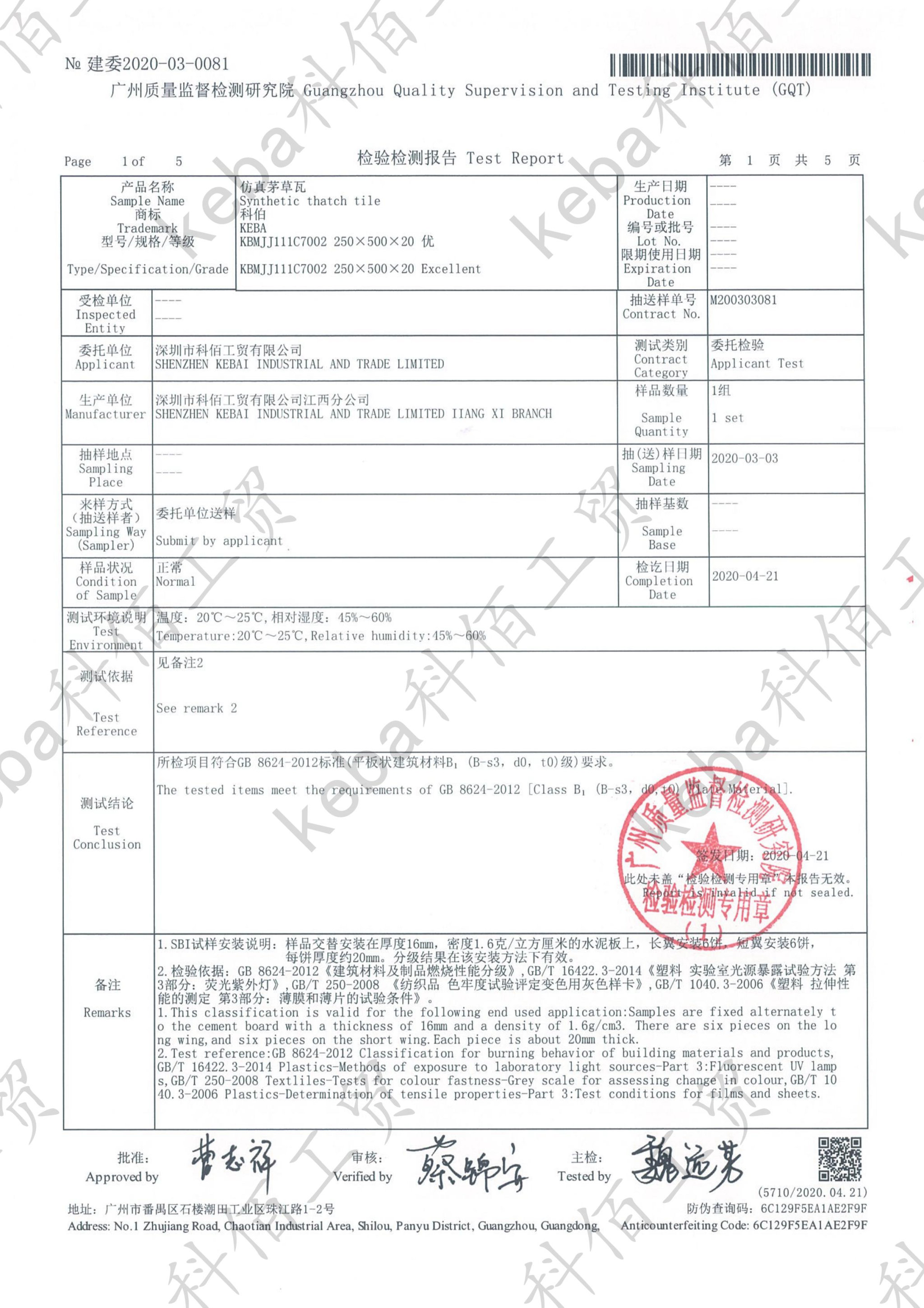 2020年科佰又成功通過廣州質(zhì)量監(jiān)督檢測研究院對仿真茅草瓦產(chǎn)品進行檢測,再一次證明科佰產(chǎn)品的質(zhì)量過硬,經(jīng)得起考驗。