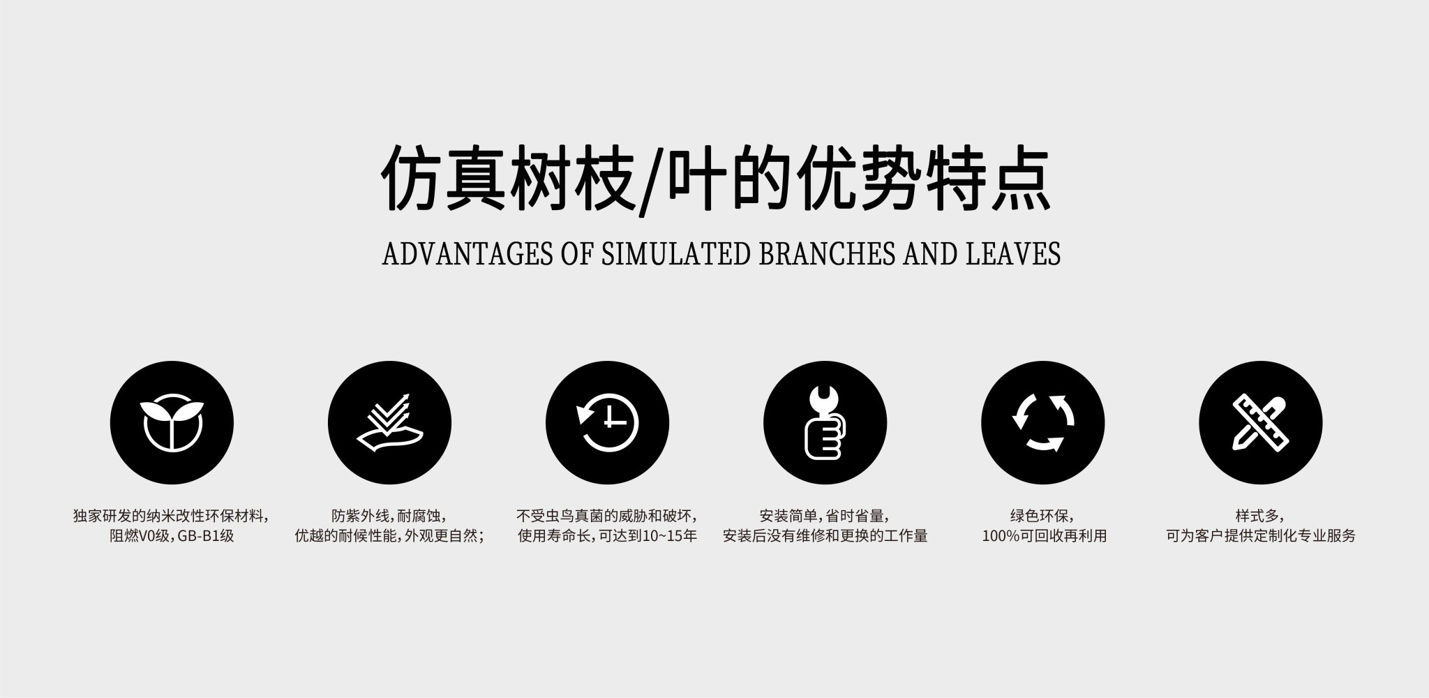? ? ? ? 仿真樹枝葉是深圳市科佰工貿有限公司采用目前國際上先進的納米合成高分子材料技術和工藝生產。利用納米粒子的特有的物理化學性質,使得其具有更加優異的耐候性及阻燃性,能滿足美國ASTM-G154-06 抗UV老化測試標準,并能通過美標UL94-V0級阻燃,在國內仿真樹枝葉也通過了國家防火建材阻燃測試B1級。?