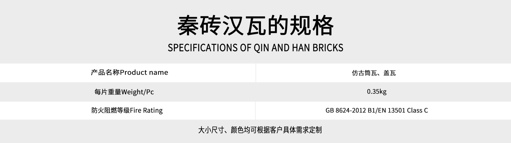 仿古筒瓦在自然環境中具有更佳尋常的耐久性,它即使長期暴露于紫外線、強光、潮濕、寒熱等惡劣環境下,仍能保持其顏色和物理性能的穩定性。經試驗檢測證明,可以確保15年△E值小于5。合成秦磚漢瓦通過了12000小時的人工老化測試,檢測結果△E=3.86。(根據太陽照射量和年日照時間,12000小時檢測試驗相當于自然使用45年,遇冷不脆、遇熱不軟,長期使用環境溫度-40℃至200℃,與鋼鐵熱膨脹系數基本一致,使因溫差產生的位移基本相等。