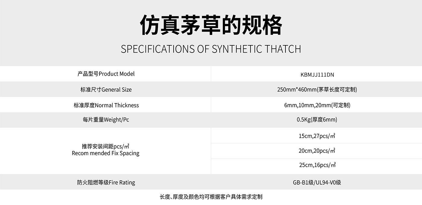 ? ? ? ? 仿真茅草是深圳市科佰工貿(mào)有限公司采用目前國際上先進(jìn)的納米合成高分子材料技術(shù)和工藝生產(chǎn)。利用納米粒子的特有的物理化學(xué)性質(zhì),使得其具有更加優(yōu)異的耐候性及阻燃性,能滿足美國ASTM-G154-06 抗UV老化測試標(biāo)準(zhǔn),并能通過美標(biāo)UL94-V0級阻燃,在國內(nèi)仿真茅草也通過了國家防火建材阻燃測試B1級。?