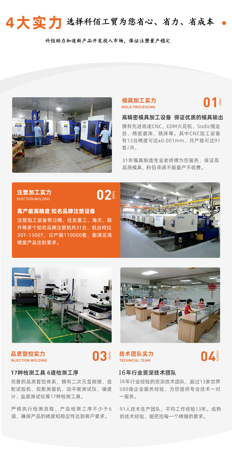 模具制造廠家科佰工貿,專業定制模具、樣品開模、模具設計、模具加工等注塑模具,擁有16年行業研發經驗,國內知名品牌企業。